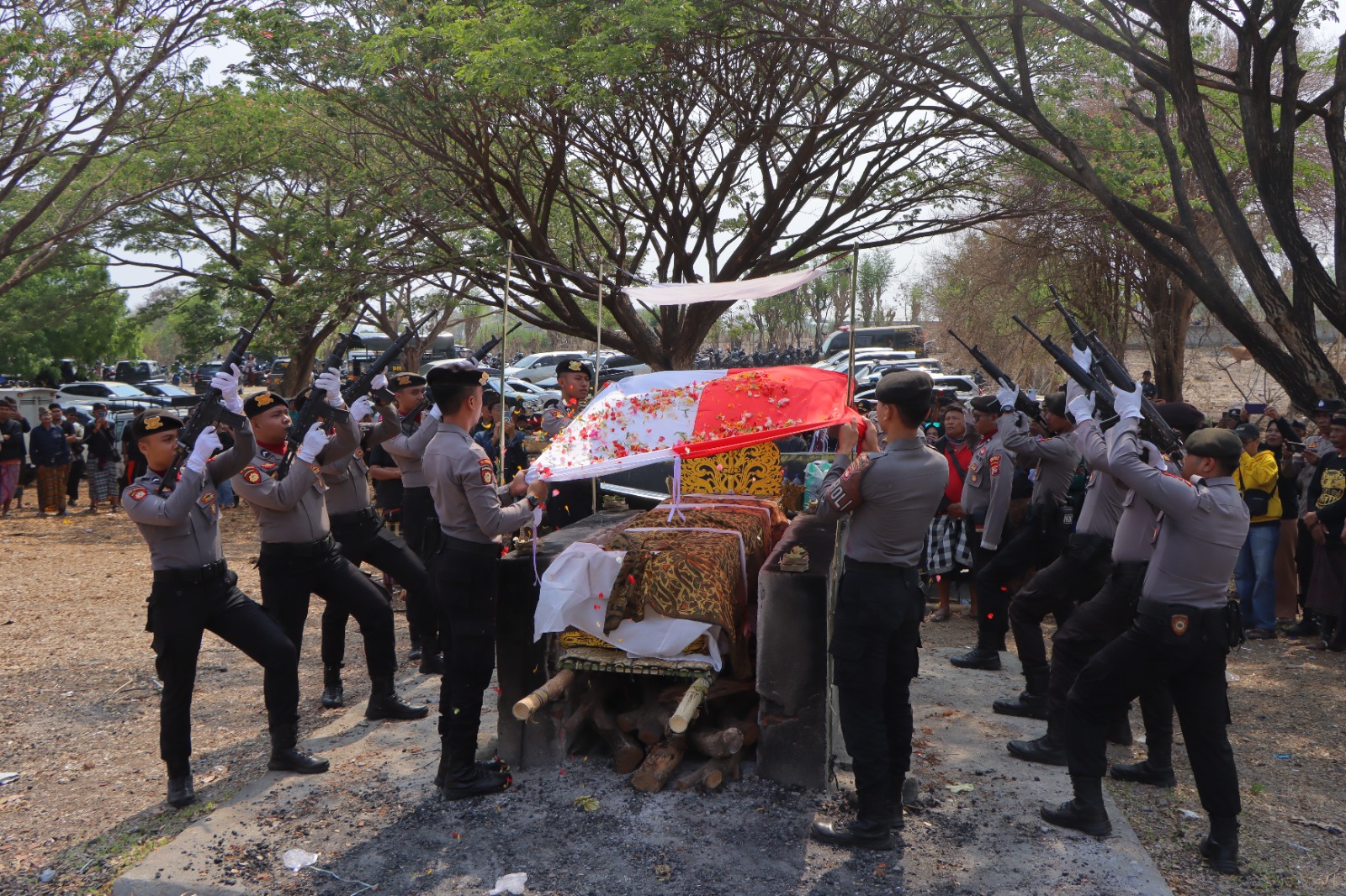 Sumbawa Besar-NTB, Sebagai wujud penghargaan dan penghormatan terakhir kepada personil Polri yang meninggal dunia, Polres Sumbawa Polda NTB melaksanakan Upacara pemakaman secara dinas kepolisian yakni Perabuan Jenazah Almarhum Aiptu I Komang Agus Antara SH., yang dilaksanakan di tempat kremasi umat Hindu Kampung Sampar Gadung, Dusun Empan Desa Labuhan Badas, Kec. Labuhan Badas, Sumbawa, Rabu (13/11/24) pagi.